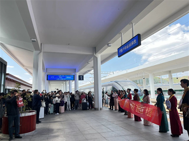 融合的重要契機。當天下午16時06分,C376次列車緩緩駛?cè)胂愀窭锢?。迪慶文旅聯(lián)合鐵路部門舉行了隆重的歡迎儀式