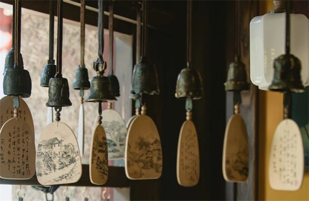 在古城,仿佛還能聽到馬幫鈴聲在歲月里回響。每個(gè)銅鈴發(fā)出聲響各不相同,下方木片上寫著充滿寓意的東巴祝福語,
